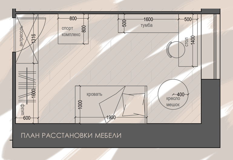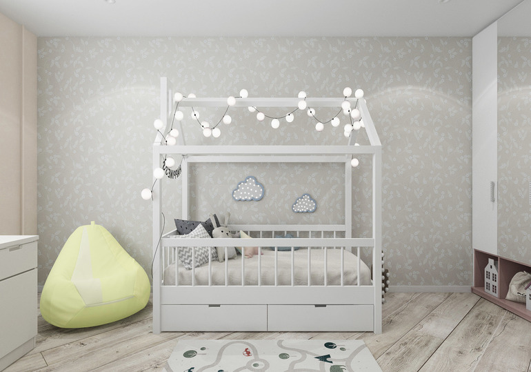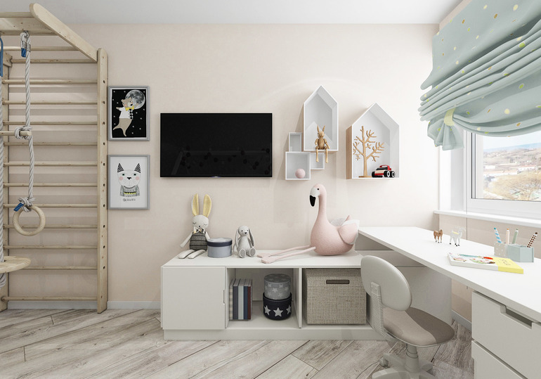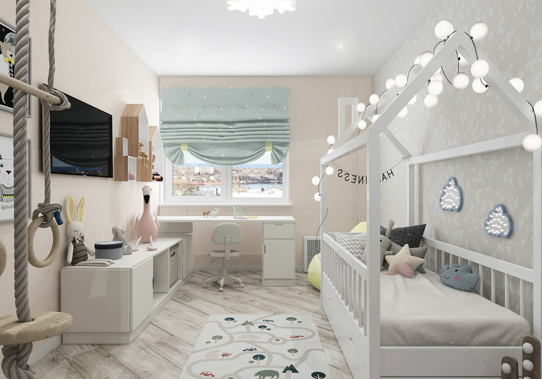 Комната довольно просторная 14,2м.кв. Создана для 5 летней малышки с учетом пожеланий родителей. Главной мечтой стала кровать-домик. Необходимо было создать места для хранения и спорт уголок.
