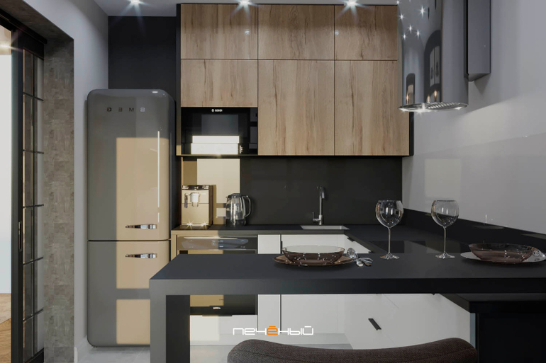 Впихнуть сюда стол так, чтобы за ним с удобством уместились все члены семьи, не получалось. В приоритете стояли места для хранения и посудомойка - это пожелание мы выполнили. Барная стойка тоже была давней мечтой владельцев квартиры, так что они только обрадовались, когда их кухня обогатилась на такой уютный уголок. :)