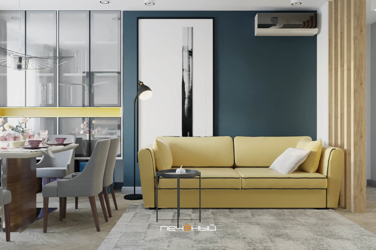 Тёмная стена, жёлтый диван - кому-то покажется, что логичнее было бы сделать всё наоборот. Как заказчики решились на такое? Всё просто: им это понравилось! :) На этапе согласования мы предлагали разные варианты цветового оформления, в том числе и с белой стеной. С жёлтым диваном получилась забавная история. Супруги сфотографировали его во время субботней экскурсии в мебельный салон: очень уж он им понравился, сразу захотелось "примерить" модель в интерьере. Так и остался! Цветовые акценты изменены ради этого конкретного дивана - бледно-жёлтый цвет достаточно легко прижился практически в каждом помещении.