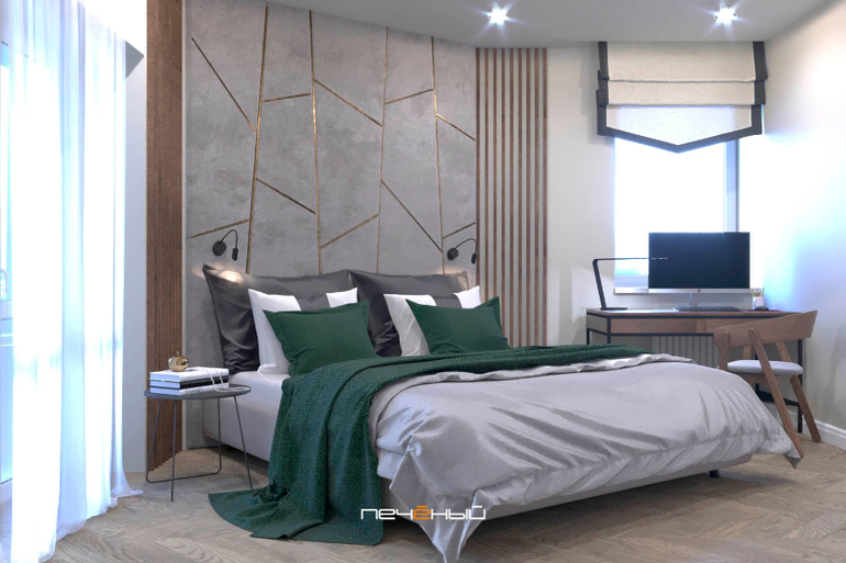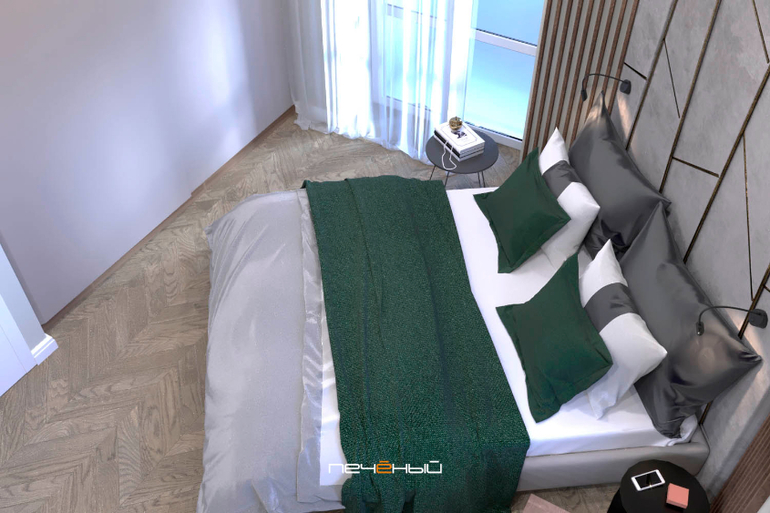 Скошенная стена в изголовье кровати - это оригинальная постройка дома. Трёхкомнатная квартира, к слову, не балует владельцев грандиозными размерами: спальня, например, получилась площадью 15 кв. м. По просьбе супругов мы ещё добавили сюда рабочий уголок, а ниже на плане можно посмотреть, как разместился шкаф в комнате и на балконе-лоджии.