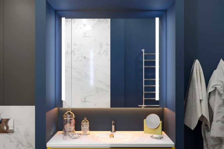 В маленькой ванной по утрам настоящее столпотворение - наверное, так во всех больших семьях. :) Поэтому в квартире предусмотрен ещё один мини-санузел - там вместился унитаз и небольшая раковина. Кстати, здесь внимания заслуживает оформление: мало кто из заказчиков решается на смелые цвета, большинство всё же предпочитает более сдержанные ванные.