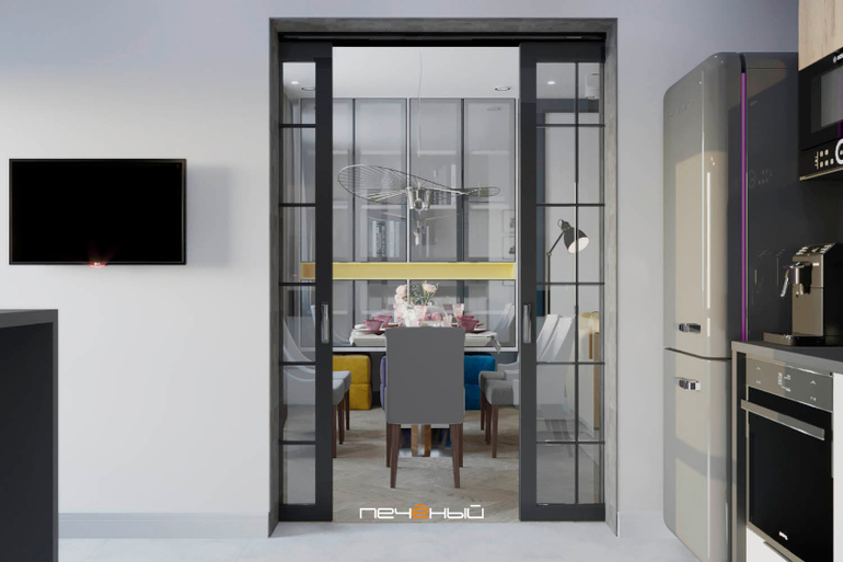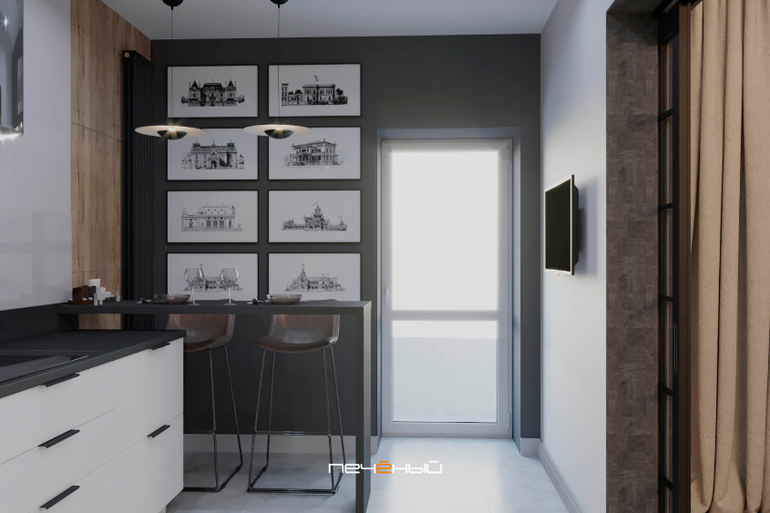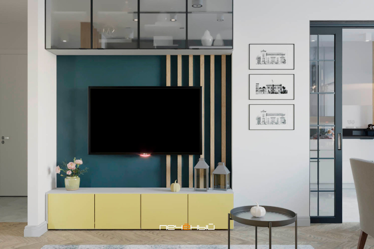 Если в обеденный стол стоит в гостиной, может показаться логичным объединить помещение с кухней: мы часто так делаем, если нас об этом просят заказчики. Если бы мы оформляли дизайн-проект трехкомнатной квартиры для другой семьи, техническое задание наверняка было бы другим. В данном случае изолированная кухня была принципиальна, а без обеденного стола в гостиной устраивать семейные ужины было бы просто негде. :)