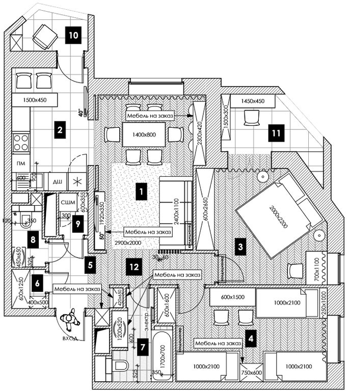 Общая площадь квартиры 86 кв. м, основная идея перепланировки принадлежит главе семейства: заказчики пришли с готовой идеей, как разместить межкомнатные перегородки в квартире. В процессе работы мы слегка её "причесали": подвинули стены, чтобы встроить шкафы, и незначительно увеличили ванную за счёт коридора.