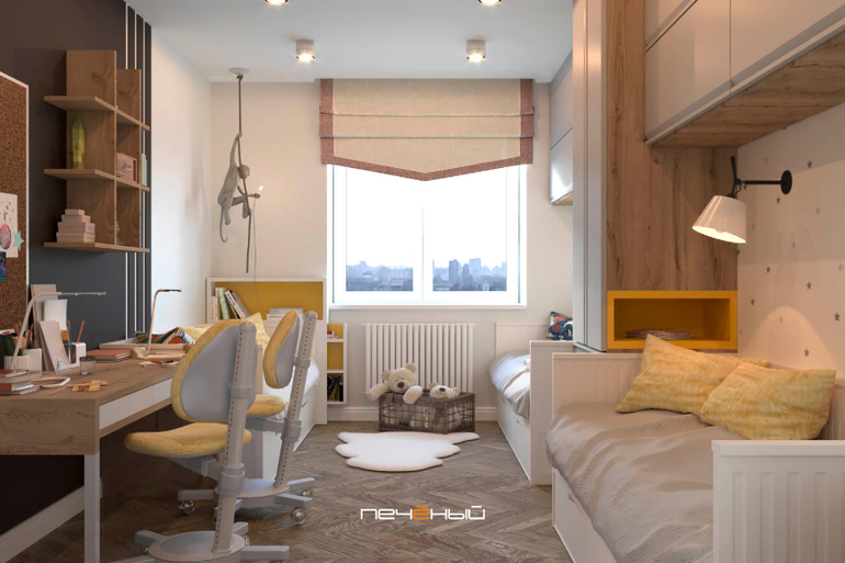 Непростая задача - разместить на 16 кв. м детской столько всего: систему хранения игрушек, уголок для школьных принадлежностей, гардероб, рабочий стол на двоих. Но самое главное - продумать три полноценных спальных места! Заказчики были настроены против двухуровневых и двухэтажных кроватей, так что нам пришлось искать альтернативные варианты размещения. Конечно, детям было бы комфортнее, будь у каждой своя комната. Но что ж поделать, придётся втроем располагаться в одной детской - главное, жить дружно)