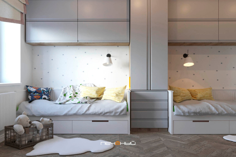 Совет: Обычно ящики под кроватями используют для хранения постельных принадлежностей, но в нашем случае будет место для игрушек - что немаловажно, своё для каждой из сестёр.