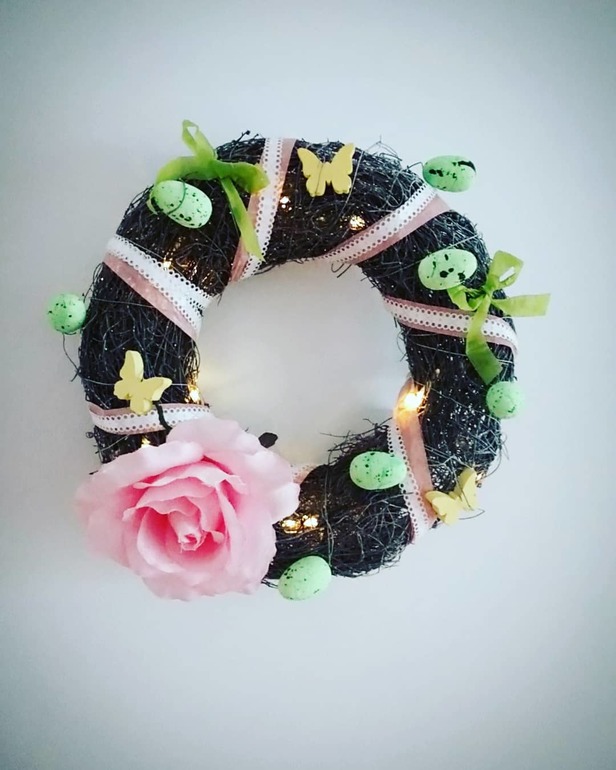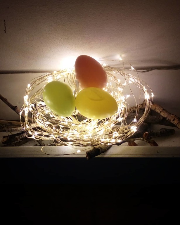 Вниз скручиваем гирлянду как гнездышко, кладём туда три яичка.