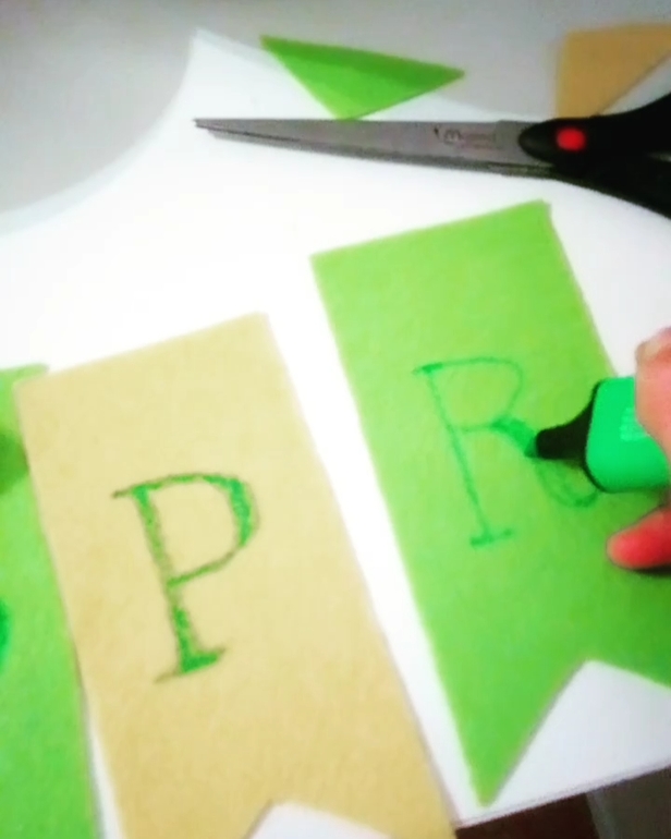Вырезаем из фетра флажки, пишем на них... Ну мы написали spring, потому что хотелось больше весенней тематики, не привязанной к религии. А так можно про пасху что-то написать.