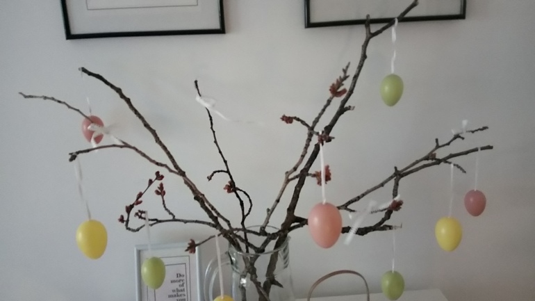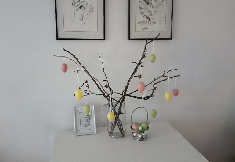 Бонусом решили украсить обеденный стол. Принесли красивые ветки из парка, поставили в графин, украсили бантиками и яичками: