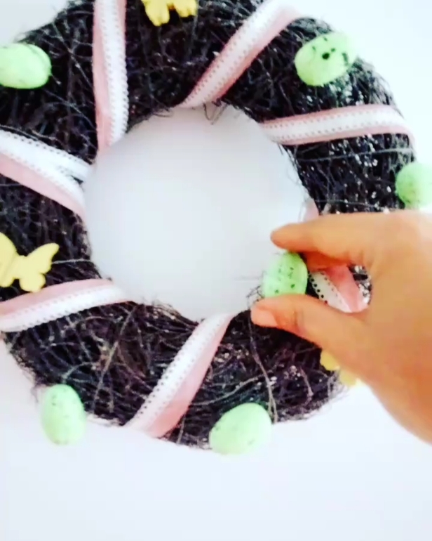 Сверху другой лентой и укрепили на него яйца и бабочек: