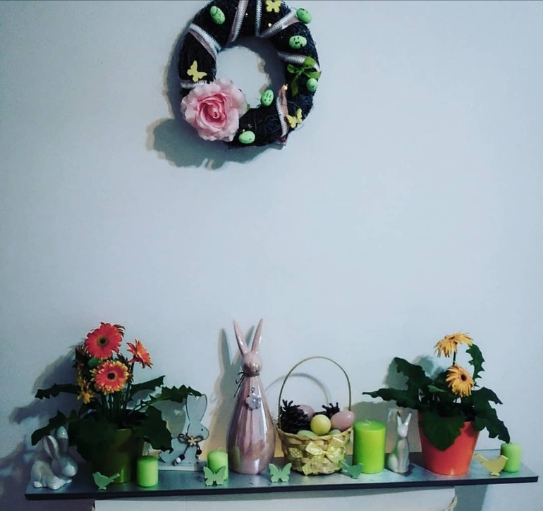 В середину поставила зайцев, свечи и корзинку с яйцами, все, что есть из пасхальное тематики. Расстановка зависит от настроения)