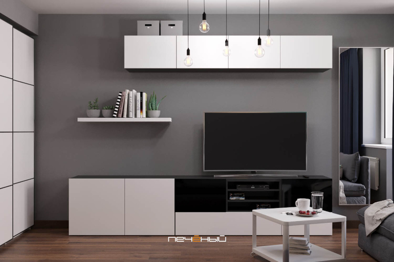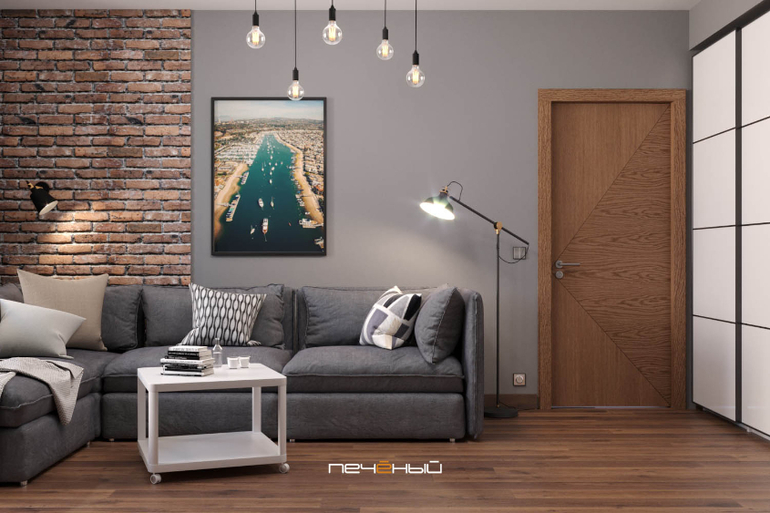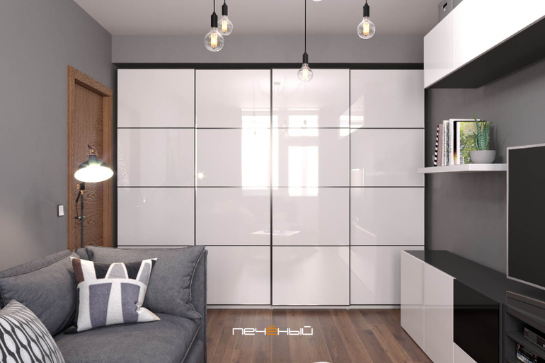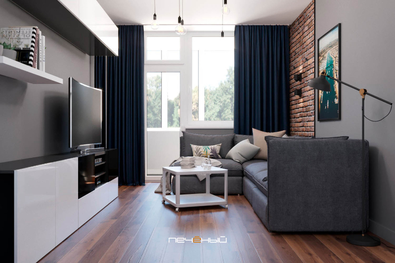 Я как дизайнер очень люблю серый в любых его проявлениях, поэтому работать было на самом деле легко. Если вспомнить ЦУ заказчика - практичность и ничего больше - то выбор цвета становится оправданным на 100%. Чтобы стены не казались скучными, решили добавить клинкерный кирпич в углу за диваном - он поддержал коричневый пол и двери. Белые фасады шкафа-купе и системы для хранения с ТВ-тумбой добавили света в прямом и переносном смысле - ведь, как мы помним, глянцевые поверхности хорошо отражают.
