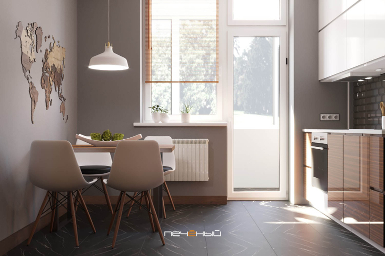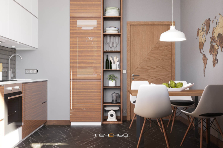 В кухне более светлые стены, чем в гостиной - здесь немного другой оттенок, потому что само помещение меньше и хочется добавить больше света. Обратите внимание на сочетание серого и коричневого в интерьере кухни - смотрится очень стильно! Стена украшена дизайнерской картой мира с гравировкой, дерево поддерживает по цвету дверь и фасады. Отдельно хочу сказать про открытые полки: поскольку там оседает много пыли, советую ставить туда только те предметы, которыми очень часто пользуетесь и завести привычку периодически протирать ячейку. :)