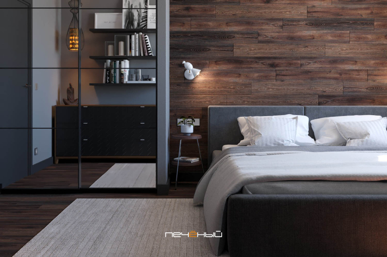 Стена в изголовье кровати обшита ламинатом, по цвету таким же, как и на полу. Хорошо смотрится на небольшом участке стены, как раз как здесь. Мы повесили напротив кровати огромный двухметровый принт, чтобы разбавить интерьер в серых тонах - фото солнечного леса очень притягивает внимание и освежает. Открываешь глаза с утра и видишь лес, круто же! :)