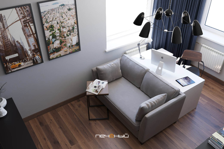 Казалось бы, зачем в квартире, которую изначально планируешь сдавать, делать гостевую комнату? Может, практичнее было бы оформить детскую? Вероятно, у заказчика сложился определённый портрет арендатора, потому он заполнял ТЗ с указанием именно таких зон. Если рассматривать квартиру в перспективе, то, конечно, комнату можно будет переделать в детскую. Но пока это удобный рабочий кабинет, совмещённый с гостевой - диван раскладывается, напротив него стоит телевизор, есть небольшой шкаф в углу. Кстати, посмотрите на интересное решение с белыми прямоугольниками в чёрных рамках: можно оставить так, можно заполнить своими фотографиями.