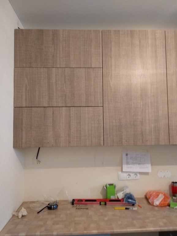 Работы было минут на 40. За которые они не только успели перевесить верхние шкафы, но и отколоть края на 2 плитках установленного фартука.