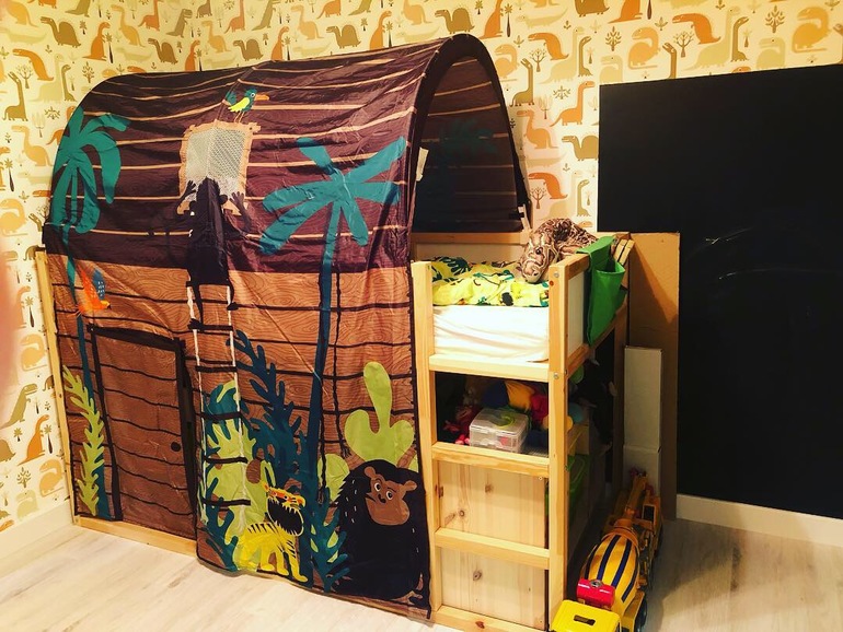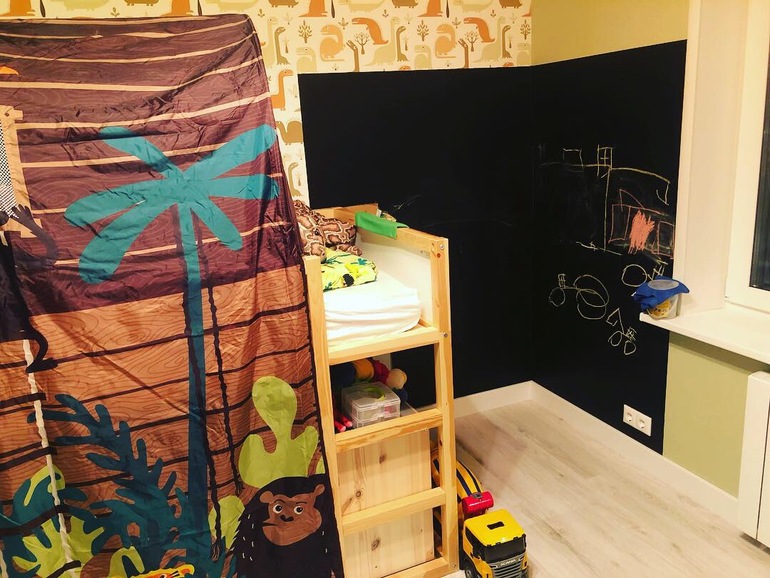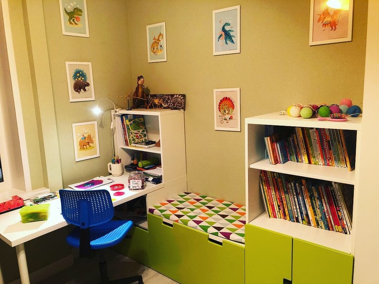 Опишу немного)) под кроватью стоит Труфаст с Лего и другими конструкторами, и там зона для игр. Почти все шкафы (кроме конструкции со столом) переехали из старой квартиры. Под скамьёй в ящике игрушки, на скамье очень удобно с ребёнком заниматься сидеть. На полках над и под столом принадлежности для рисования, лепки, занятий. Под книжными полками настольные игры. В белом шкафу одежда. Не хватает ещё полок в углу (где коробка) для больших игрушек. Ну и шторы осталось выбрать. Хочу римские на раму, чтоб пыль не собирали.