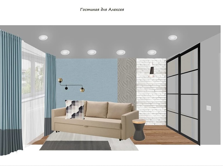 Я в голосовании отметила, что мне понравилось. Но оформление стен, на мой взгляд, ту мач! Даже в том варианте, где полосы из кирпича. Возможно, если заменить кирпич на вертикальные деревянные реечки, будет лучше. И, если предполагается, что в гостиной будет находится больше, чем один человек, то добавила бы кресло или пуфик. А также журнальный столик (тот, что в проекте, тоже бы оставила). Бра в конкретной комнате заменила на торшер. На стену над диваном - пару графичных постеров в паспарту. Понравилось сочетание текстиля и Бесто.