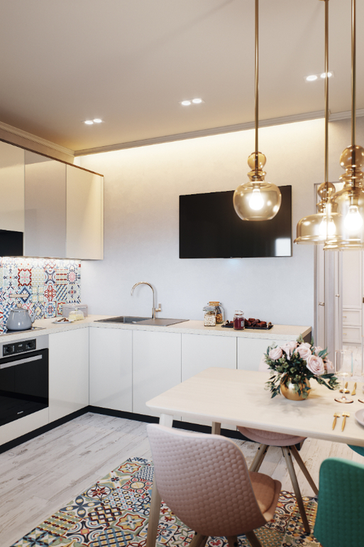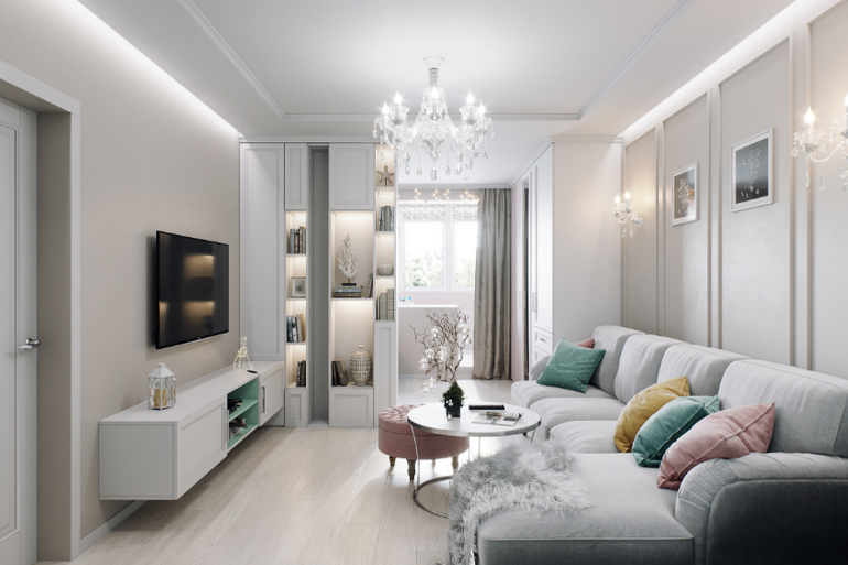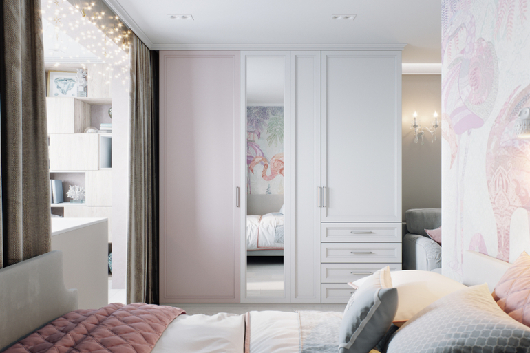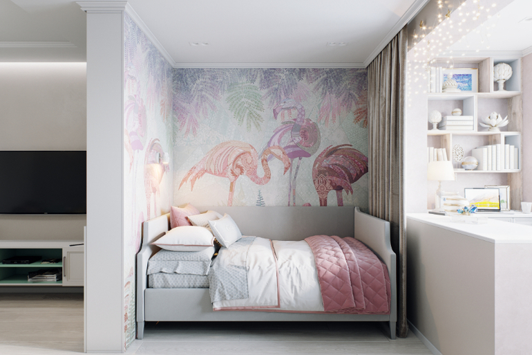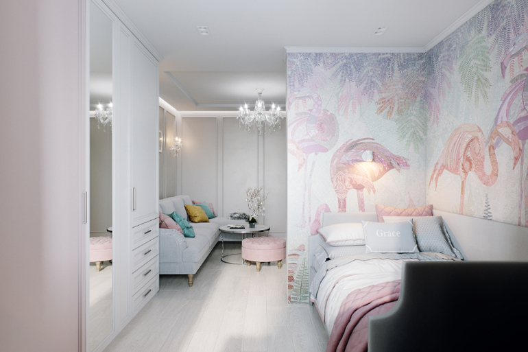 Очень нежная воздушная квартира получилась. Единственное, не поняла идею объединения детской и гостиной. И жаль, что половина фламинго оказалась без голов.