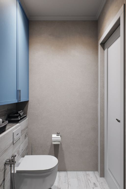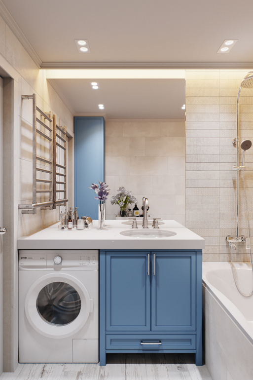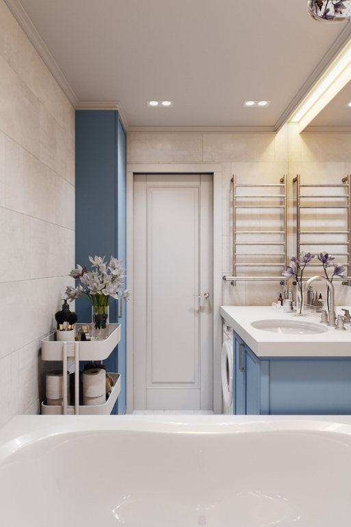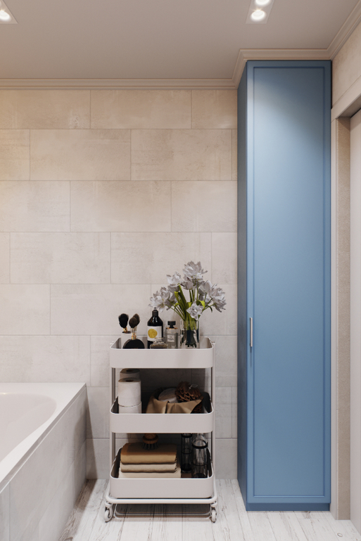 В ванной комнате вместо сомнительного стеллажа на колесах лучше была бы корзина для белья с 2-3 отделениями для сортировки. По стоимости тоже самое, а вот функционал лучше. И вот насчет полотенцесушителя - очень не удобно будет вешать на него банные полотенца. Предполагается ли другое место для их сушки? Опять же целая стена пустая - вместо стеллажа лестницу-стеллаж с корзинкой для белья внизу и местом для сушки полотенец выше...