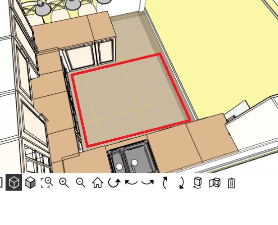 И по красной и по зелёной линии нужно будет сочетать цвет пола и столешницы. Они слишком близко для "разнобоя"Я бы сделала единым полотном
