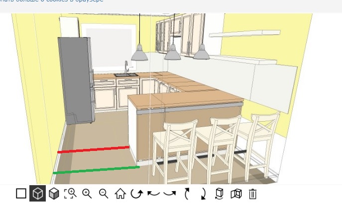В гостиной (да и везде на 1ом этаже кроме с/у) будет керамогранит под дерево елочкой. Муж за единый пол с кухней, так как двери нет, только проем. Я хочу в кухне другой пол, так как планирую столешницу под дерево, и мне не очень нравится, когда на полу "дерево" и потом еще одна поверхность с "деревом", что обязывает их сочетать, да и вообще. Если делать другой пол, то скорее всего это будет квадратная плитка 60*60 под камень светло серая. При таком варианте, откуда лучше начать плитку кухонную: от проема, от зеленой линии, чтоб чуть-чуть визуально смазать границу кухня/гостиная или от красной, чтобы четко обозначить рабочее пространство (хол-ка там не будет, получается четкий прямоугиольник)?