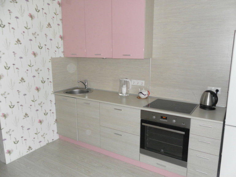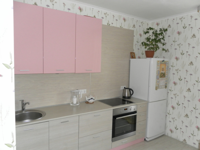 Интерьерное решение кухниЭто кухня, которая мне пришлась по душе, с учетом наших весьма скромных финансов. Без техники она обошлась нам в 29500 руб. вместе с панелью. В уходе цветовой выбор оказался удачным, на фартуке не видно следов жира совсем, приходится смотреть под разными углами, чтоб отмыть (я же знаю, что он там есть, просто его не видно).Холодильник со старой квартиры, в белом цвете как бы ни к чему, но пока работает и на том ему спасибо, т.к. очень много переездов пережил с нами. После загрузки шкафов провисли дверцы, но нас об этом предупреждали и любезно предложили приехать подтянуть, но муж сказал, что сделает сам, поэтому они до сих пор провисшие.Обои на любителя, но я аптекарь, и для меня это очень все родное, пробуждает тёплые воспоминания о студенчестве, детстве в деревне у бабушке. Вся концепция дизайна нашей квартиры и сводилась к моим воспоминаниям, так скажем, для меня было важно передать часть моих теплых воспоминаний моему жилищу. Так, в коридоре у нас обои с березками, напоминают мне то, как украшали березовыми ветвями избу на троицу, для нас, детей этот праздник означал открытие купального сезона, лето официально началось. Что-то я отвлеклась от кухни...Мне хочется только стену слева от раковины, где заканчивается фартук как-то обыграть, чтоб не бросался в глаза острый угол, но пока не придумала как, может у вас будут какие-то идеи? Добавила фото коридора, раз уж написала)