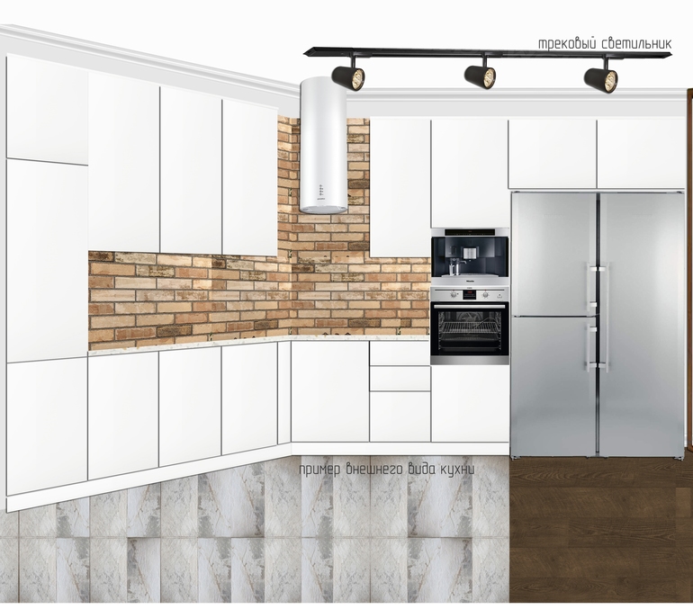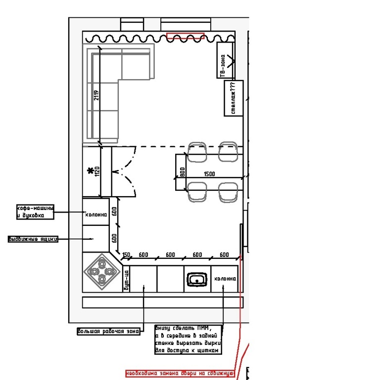 - тк было необходимо разместить много техники, стало очевидно, что в линейную кухню не удастся поместиться и нужно делать угловую;