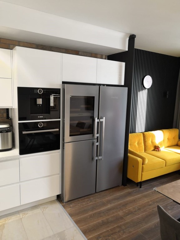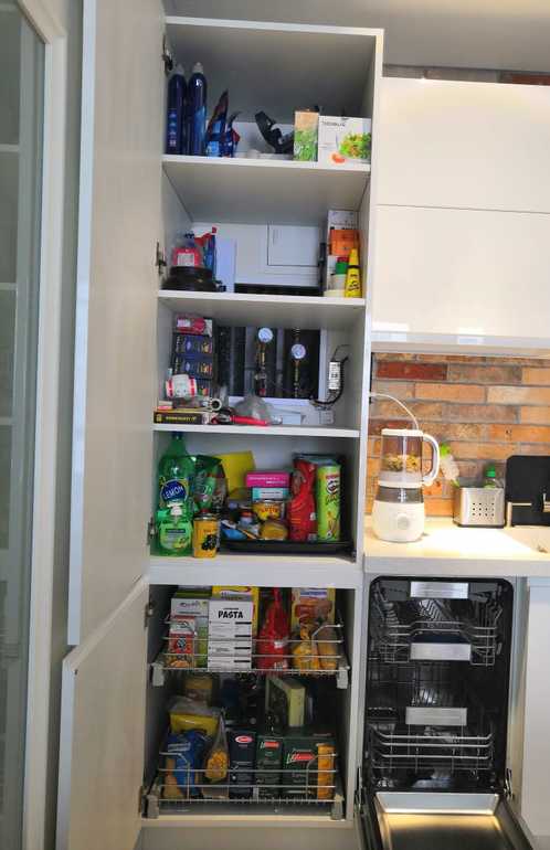 - лючки же я предложила прикрыть пеналом. В нем сделаны съемные полки для доступа, которые очевидно отодвинуть проще, чем двойной холодильник;