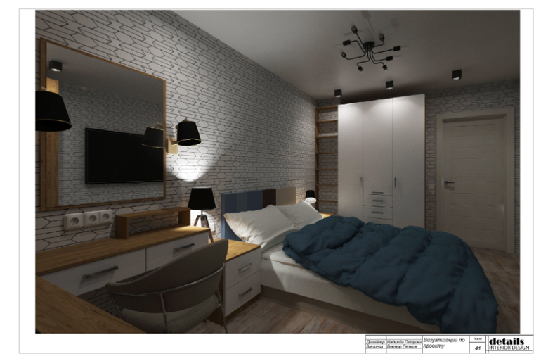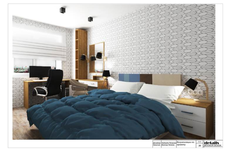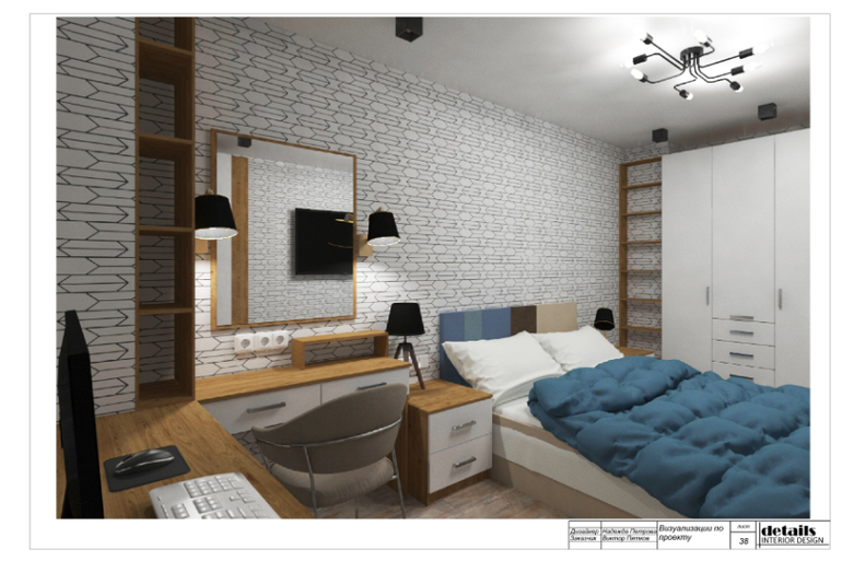 В итоговом варианте расстановки мебели в спальне большое рабочее место у окна, небольшой макияжный столик с зеркалом и подсветкой. Широкая кровать с прикроватными тумбами, напротив разместили большой телевизор, по сторонам два вместительных шкафа.