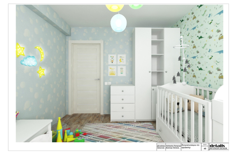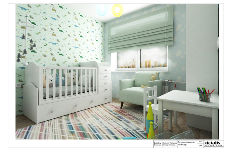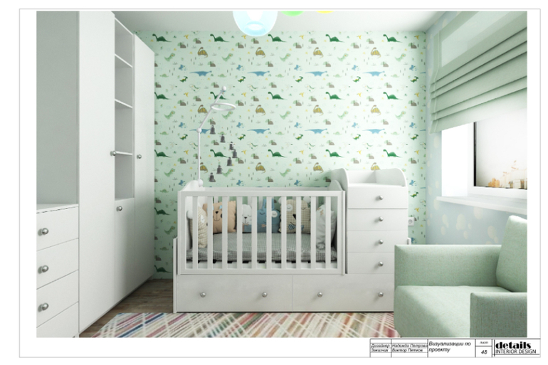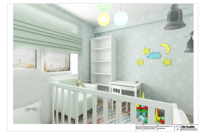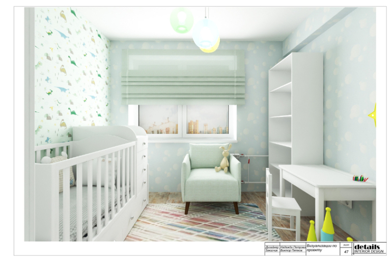 У хозяев квартиры в планах появление ребенка, поэтому маленькая комната была оборудована под детскую. Предусмотрели кровать-трансформер (на вырост) с комодом и люлькой, у которой высокие бортики. А когда ребенок подрастет, будет полноценная кровать и дополнительный комод. Напротив кровати детский столик и стеллаж для книг и игрушек. Так же в комнате есть дополнительный комод и шкаф для хранения одежды и детских принадлежностей.