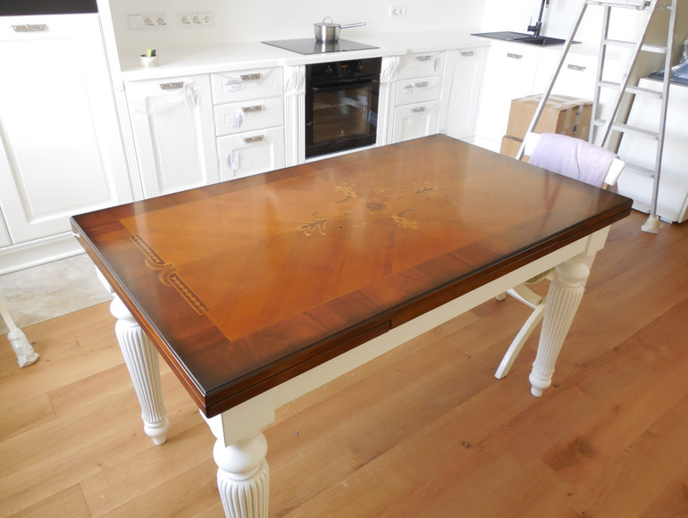 Сейчас модно сочетание белого с деревом. Вы собирались делать каминную доску над камином, ее как раз можно сделать из дерева. И, кстати, белое сочетают с деревом даже в классических изделиях.