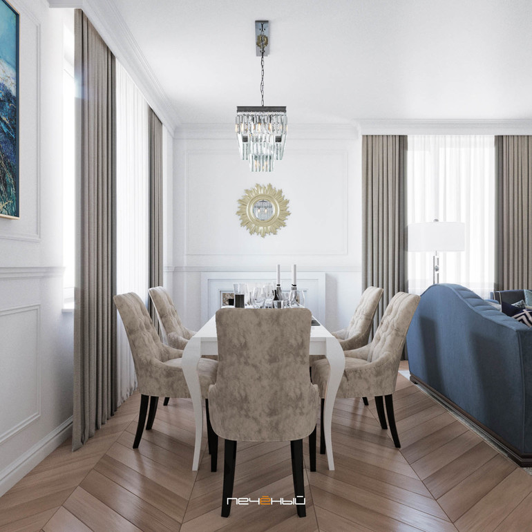 Молдинги на стенах, карнизы, потолочные светильники, масляная картина на стене, форма стульев и стола - здесь всё задаёт классическое настроение. На полу лежит паркетная доска, и способ укладки тоже характерен для выбранного стиля - "французская ёлочка". Классические интерьеры могут быть довольно тяжёлыми для восприятия, но именно этот мы постарались сделать максимально воздушным и умиротворяющим.