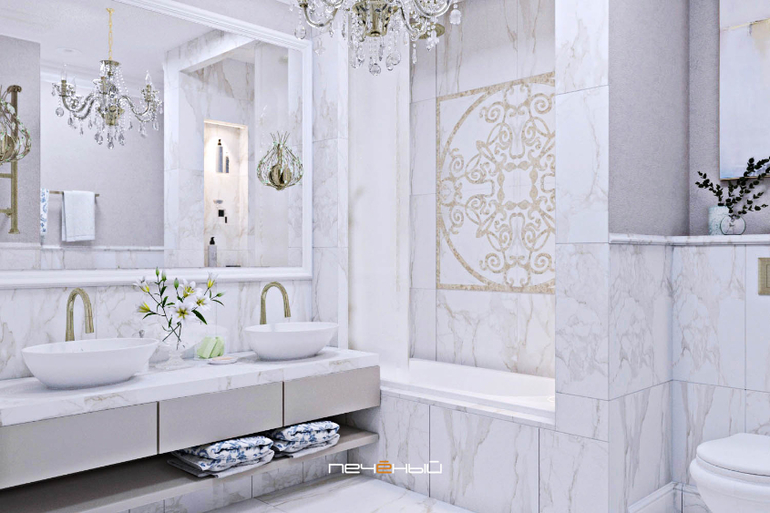 В квартире есть ещё маленький гостевой санузел, который расположен у входа в квартиру - его видно на плане ниже под номером 9. А тот, что на фото - хозяйский, вход в который находится прямо возле спальни и напротив гипотетической детской. Детскую, к слову, для этого проекта мы не делали.