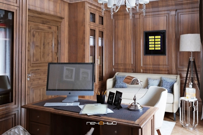 Заметно, что кабинет другой по настроению - его оформлением занимался мужчина. Делал, так сказать, свою берлогу с идеальным рабочим местом. :) В этой комнате всё отличается: и пол, и дверь, и отделка стен деревянными панелями.