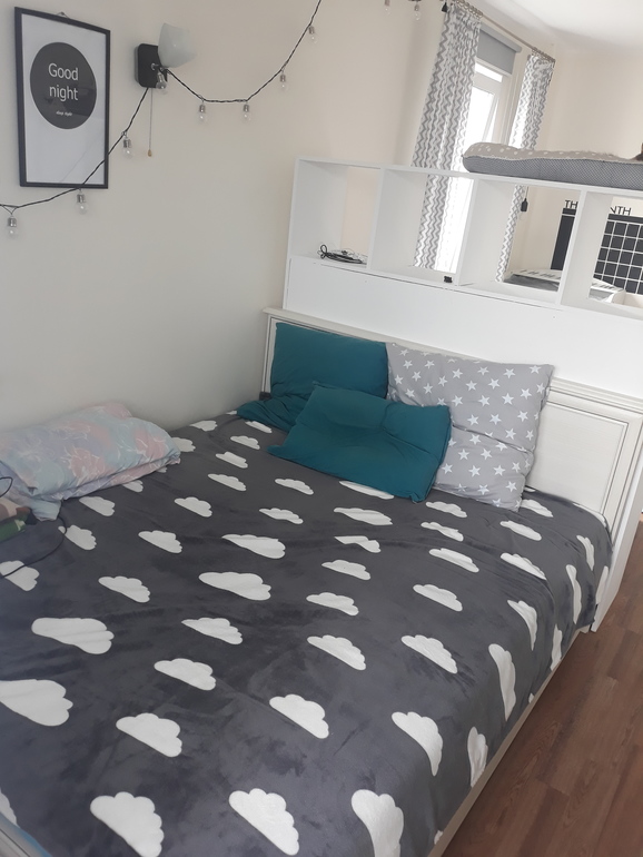 У нас балкон и окно, разделили зоны стеллажом. Отказываться от кровати не думали)