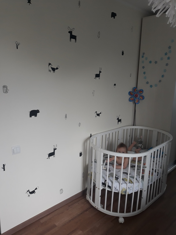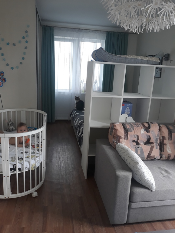 У нас была кровать в алькове, шкаф, детская кроватка и диван, чтобы удобно кормить и отдыхать во время укладывания спать. По противоположной стене книжный шкаф, который использовали для одежды и тумба тв и антресоль для документов и прочих недоступных для ребенка вещей. Расставили спальные места взрослых и ребенка по дальним сторонам намеренно. Я приняла решение, что буду вставать к ребенку. У кого кухня от 8м2 можно диван туда, на случай если приедут родители помочь или гости будут. Но мне нравится диван около ребенка, на кровати сидеть не удобно...