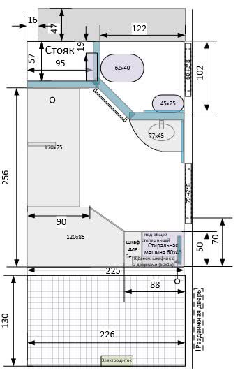 если помещение 122 х 102 это туалет, то надо продумать располжение унитаза. Сейчас, кажется, что сидя на унитазе вы будете плечами стенки подпирать и ванну большую поставить, чтобы в ней поваляться.