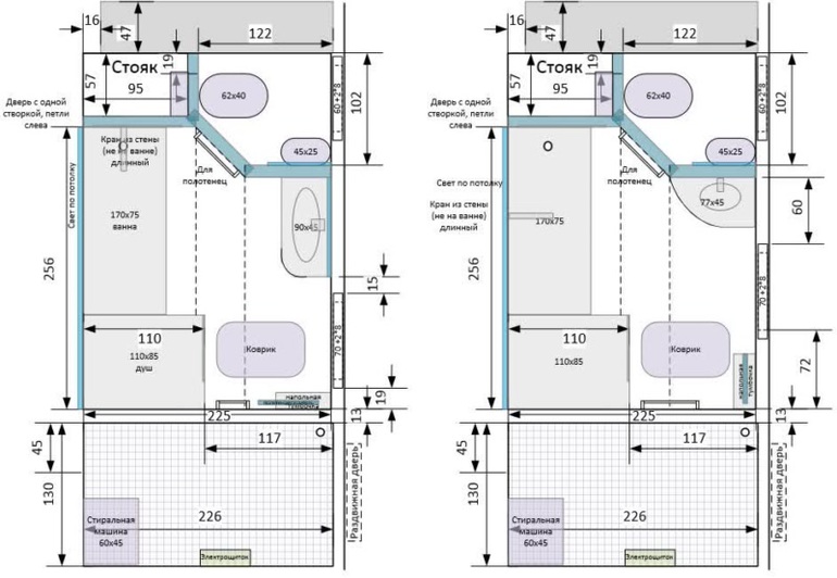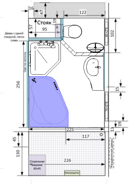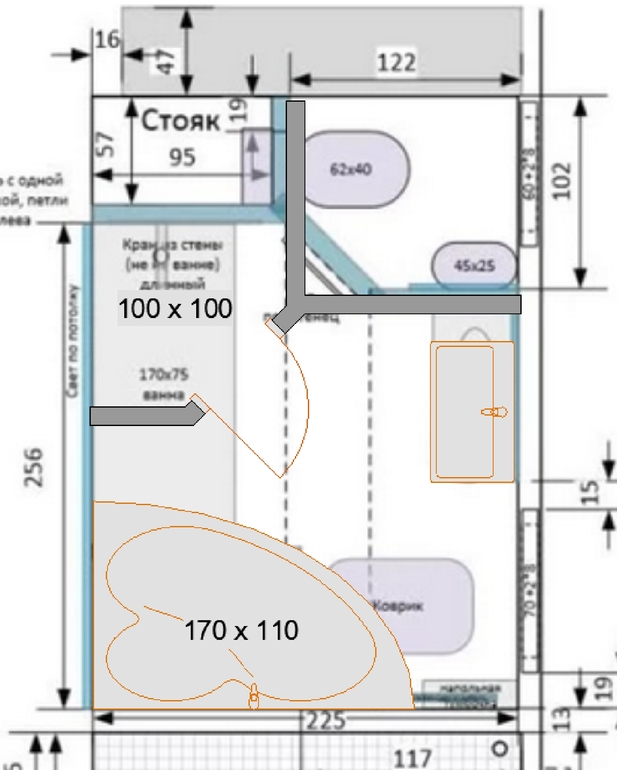 Добрый день! Может, еще вот так попробовать, чтобы душ не был напротив входной двери и чтобы не было выступающих углов: Можно еще перенести дверь, как в 3-м варианте. Длина ванны 170 см - это, чтобы целиком лежать на дне под водой?))