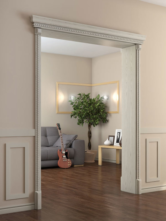 У меня аналогичный вход на кухню. Дверь только съедала место. Оформили все порталом, но скромным, без финтифлюшек.