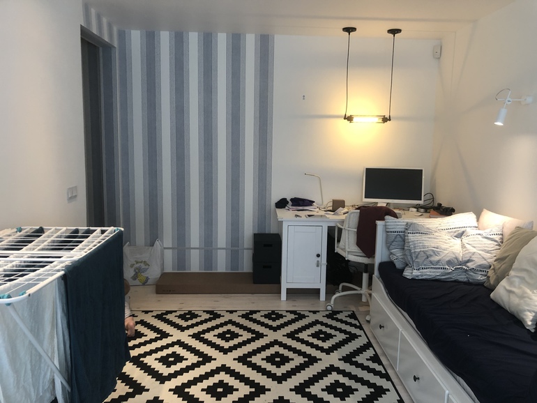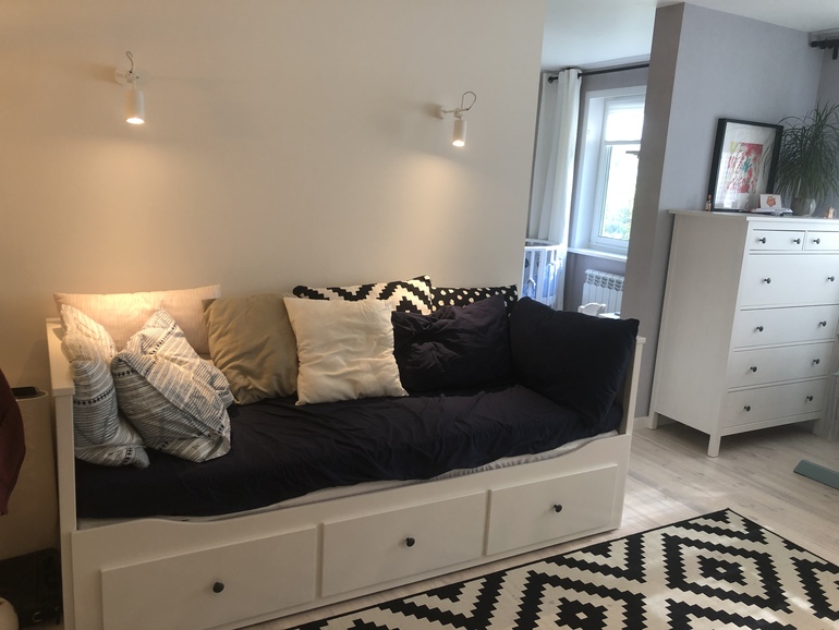 Размер квартиры диктует жесткие правила проживания - мало вещей, лишнее сразу отвозится на хранение за пределы квартиры. Балкона нет, первый этаж.