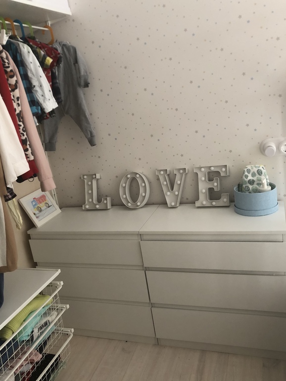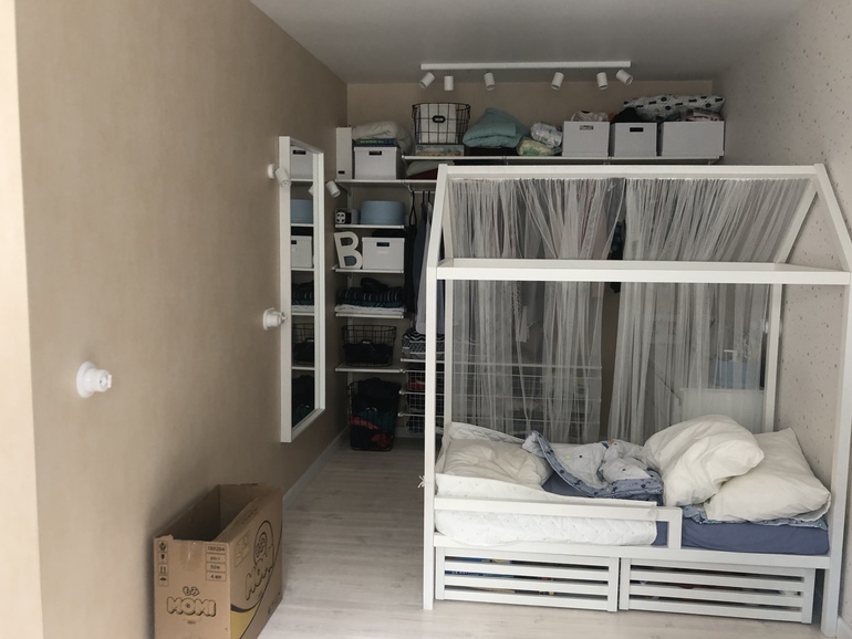 Начнём с детской. Тут спят 2 мальчика: почти 3 лет и 8 месяцев. Игрушки хранятся в выдвижных ящиках под кроваткой и во второй комнате (хотя обычно валяются на полу, но для фото я прибралась чутка). Коробка - любимая игрушка, никак не могу уговорить ее выкинуть :D В шкафу вещи всей семьи.В ближайшее время сменю ковёр, как только новый проветрится.