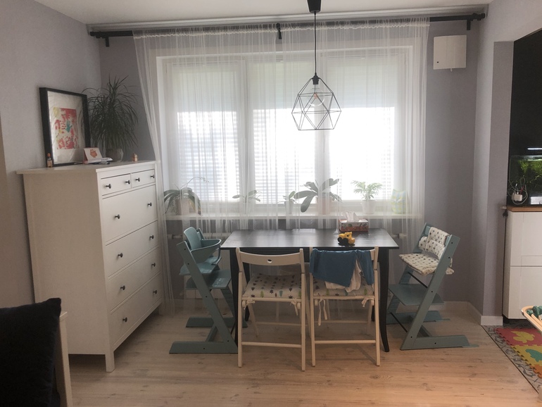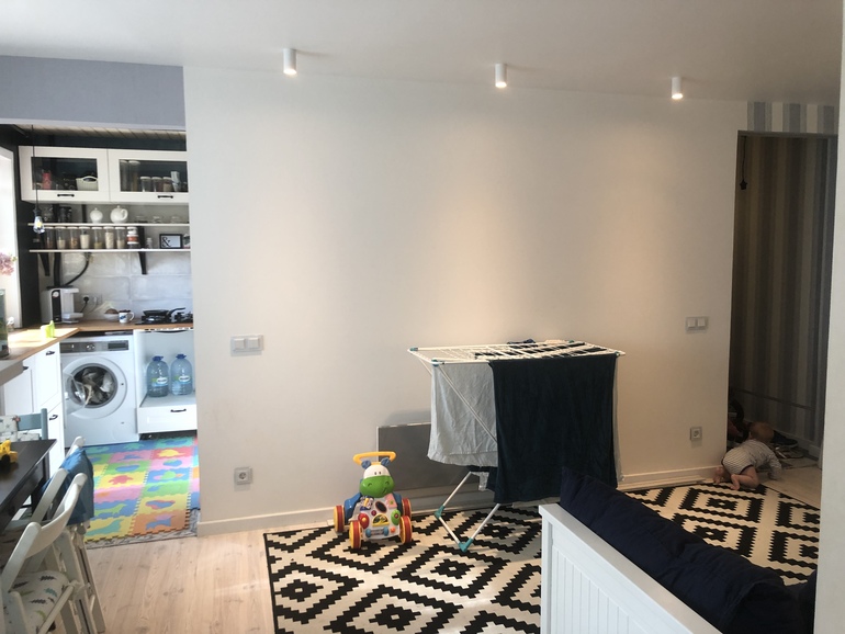 В зале на диване спим мы с мужем, в ящиках опять же игрушки. За столом все кушают, потому что на кухне почти 6 квадратов нет места для стола. Возле стены сушилка для белья, бесит ужасно, но на ней постоянно что-то сохнет, поэтому она не убирается. За ней на стене обогреватель. Играем в основном в этой комнате. Возле стола мужа будет стеллаж для книг, он пока в коробке, может завтра соберём.
