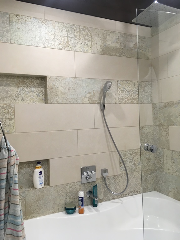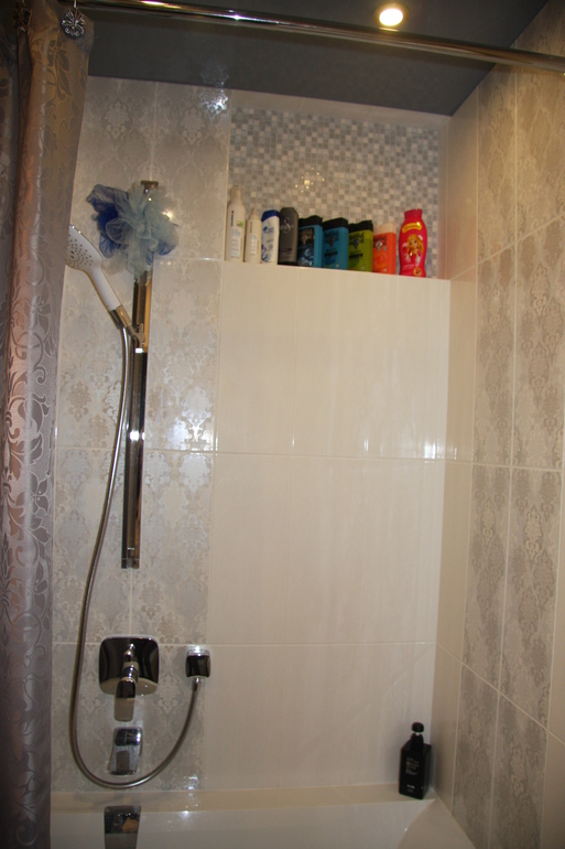 Но, видимо, в подсознании настолько уже привыкла к этой ванне, что на новой квартире захотелось чего-то принципиально другого. Сейчас вот делают - глянец и преимущественно тёмный (светлая зона над ванной самой):