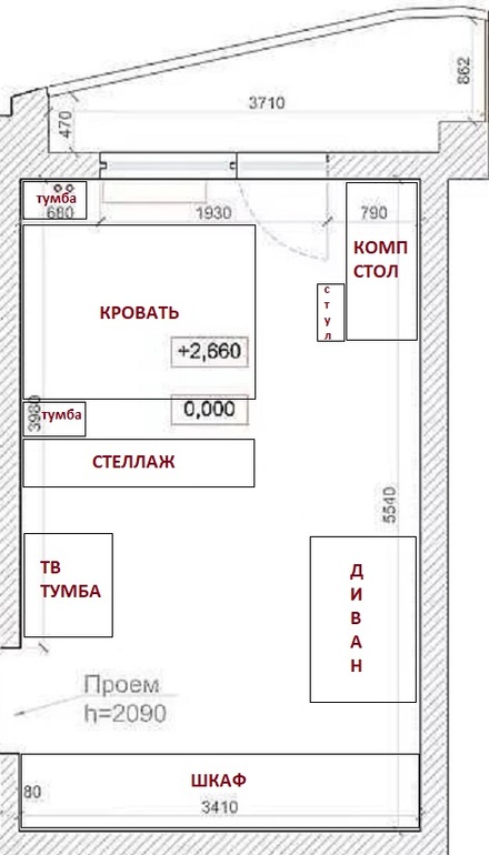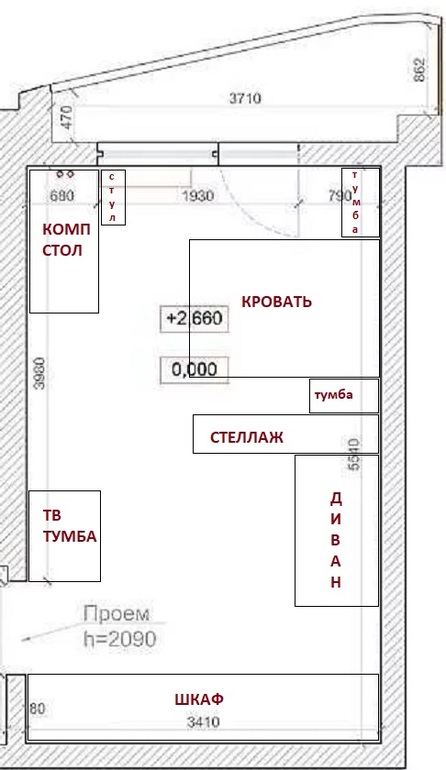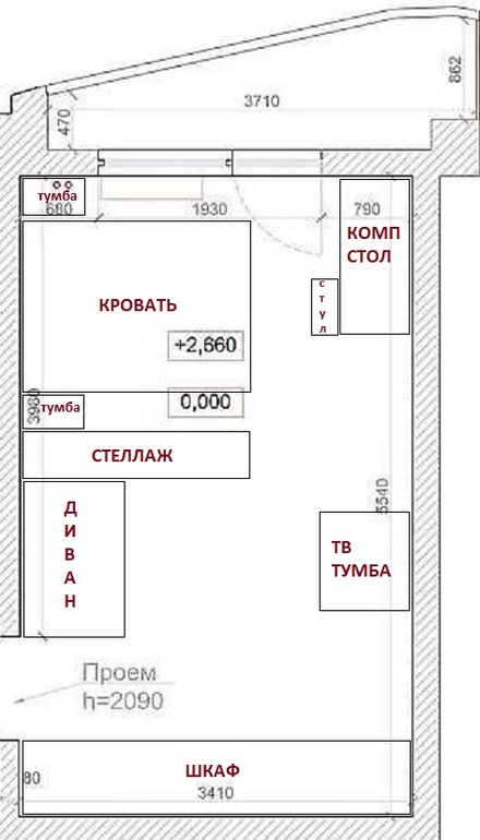 А про первый поясните, пожалуйста - не поняла как комп влияет на балконную дверь? Дверь где изголовье кровати и тумба прикроватная.