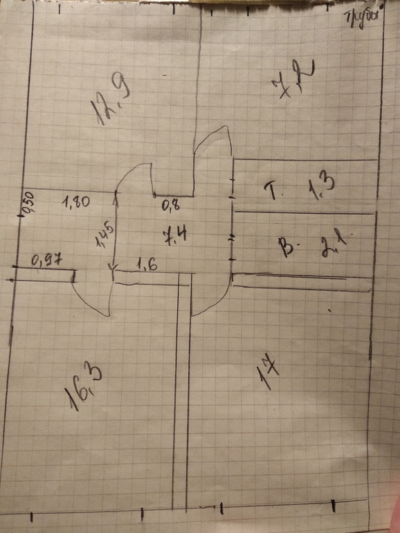 Вот и пришла мне идея, самую маленькую комнату поделить между кухней и коридором. Стены не несущие. Получился бы холл и длинная кухня/столовая/гостиная. Но в этом случае наша спальня будет пополам с младшим сыном, ему скоро шесть, и только у дочери своя отдельная комната.