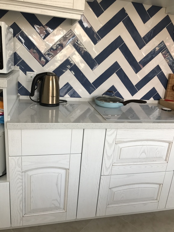 Мы решили сделать стекло однотонное. Сейчас плитка с сечением как мозайка и со временем ее отмывать просто надоело. Стекло кажется в плане уборки будет удобнее.