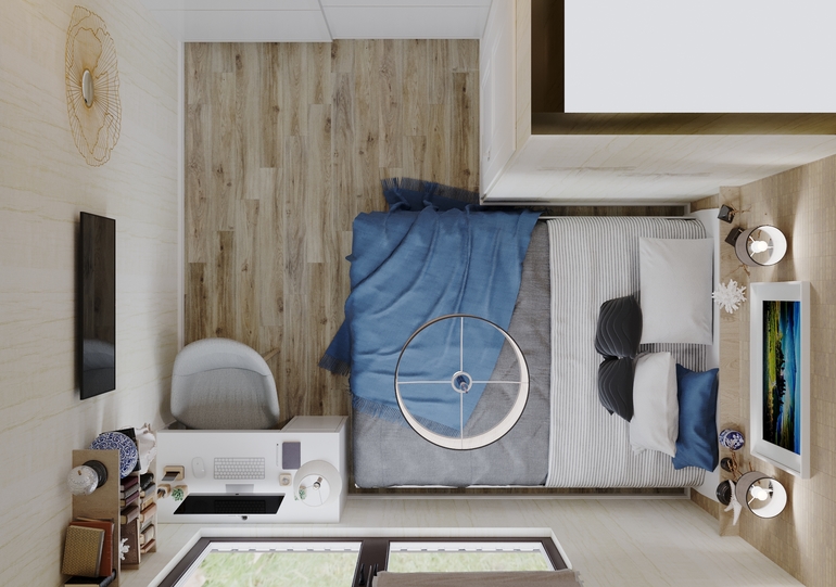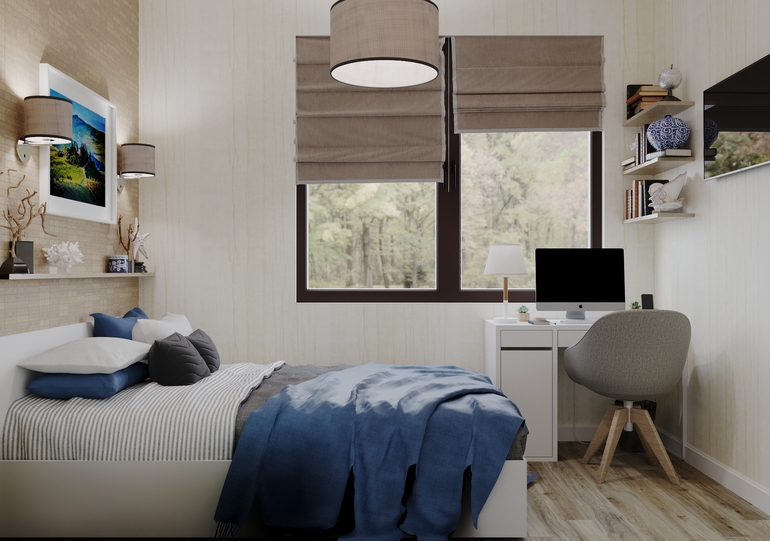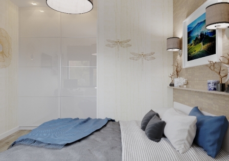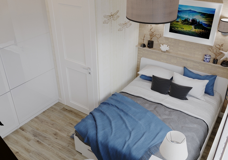 Спальня получилась,как закуток, так выбрали заказчики. Другие варианты были бы проходные. Но на мой взгляд это уютно в такой ситуации.