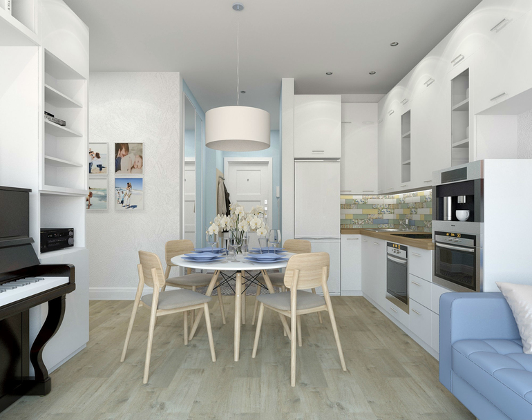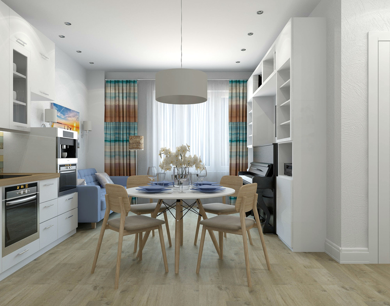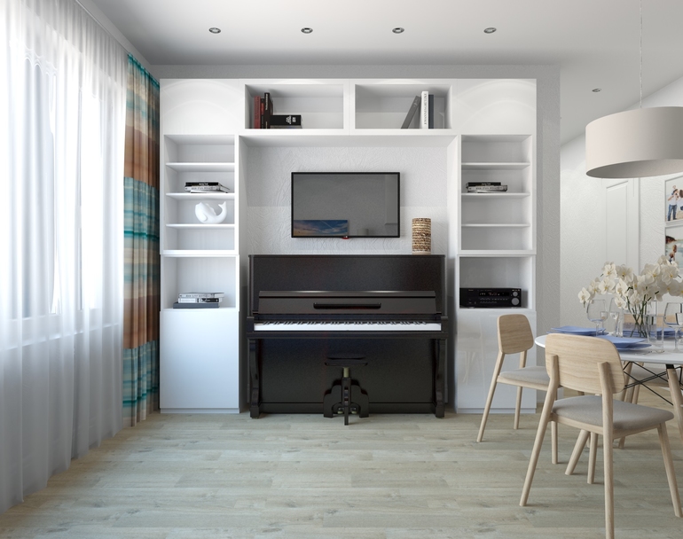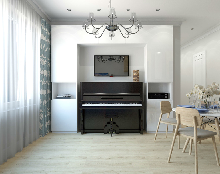 У заказчиков было много условий расположения вещей ,которые у них уже были - картины,пианино,утварь и тд.