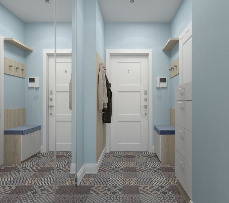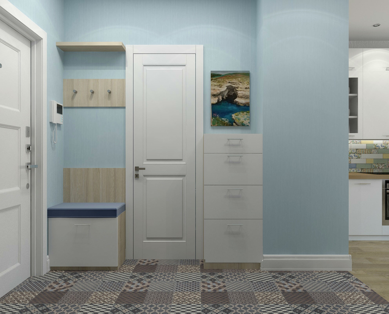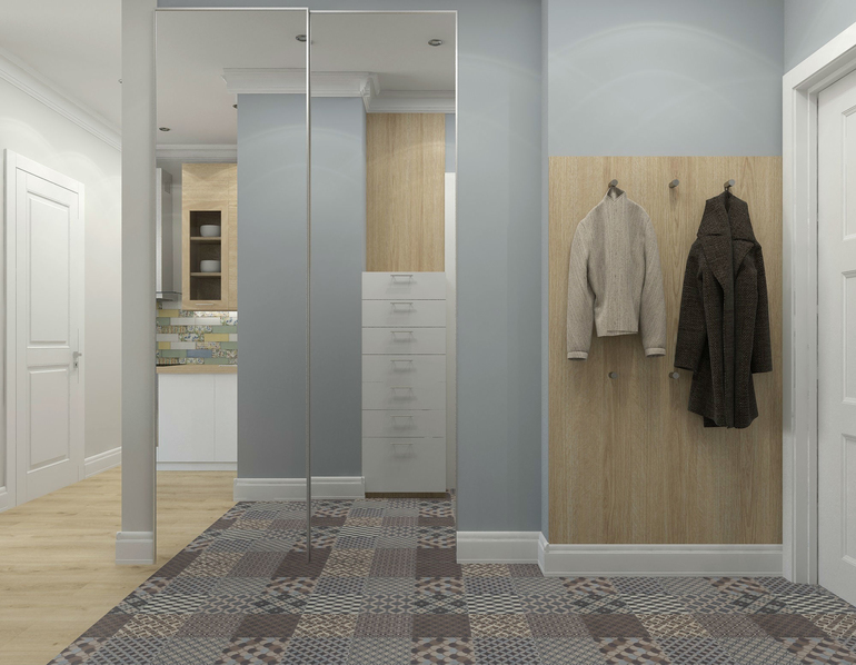 В квартире прихожая практически на виду и нужно было вписать ее в интерьер гостиной: