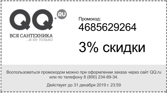 Здравствуйте. Непосредственно с вашим вопросом не поможем, но можем предложить воспользоваться промокодом на скидку в интернет-магазине сантехники https://qq.ru/ (действует до 31 декабря 2019 г.), а также, при необходимости, промокодами на скидки при покупке мебели, светильников, декора, обоев и напольных покрытий (перейдите по ссылке на страницу нашего сайта).